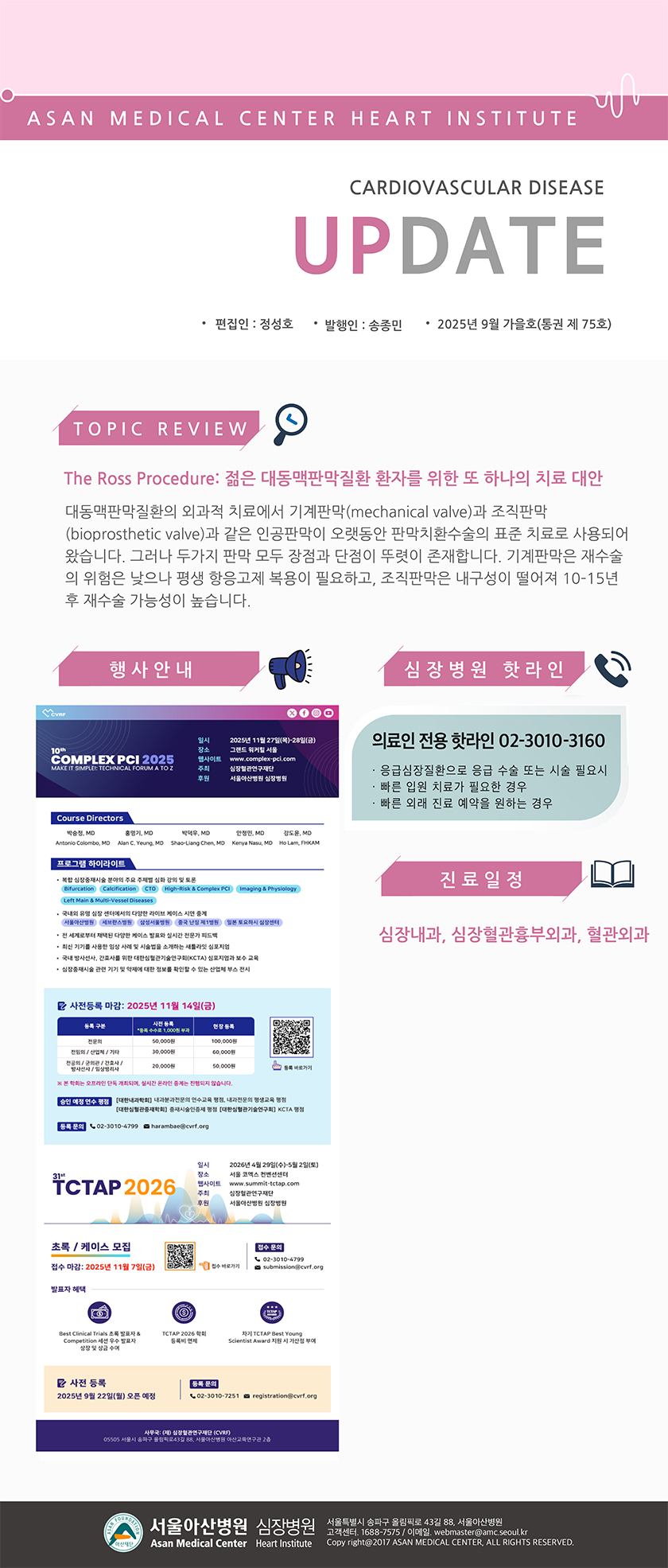 Cardiovascular Disease Update 2025년 가을호 (통권 제75호) The Ross Procedure: 젊은 대동맥판막질환 환자를 위한 또 하나의 치료 대안 Cardiovascular Disease Update 2025년 가을호 (통권 제75호) 행사안내 Cardiovascular Disease Update 2025년 가을호 (통권 제75호) Hotline Cardiovascular Disease Update 2025년 가을호 (통권 제75호) 진료일정안내