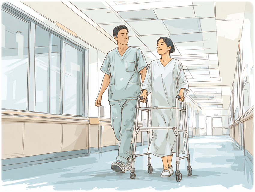 수술 후 빠르게 움직이기 시작하는 것은 전신 마취로 인해 감소한 폐 기능 회복을 돕고, 혈액 순환과 장 운동을 촉진하며, 근육과 관절 기능을 살려 빠른 일상 복귀를 돕기 위함입니다. 물론 환자의 상태와 수술의 종류에 따라 시작 시기나 방법은 달라질 수 있습니다.